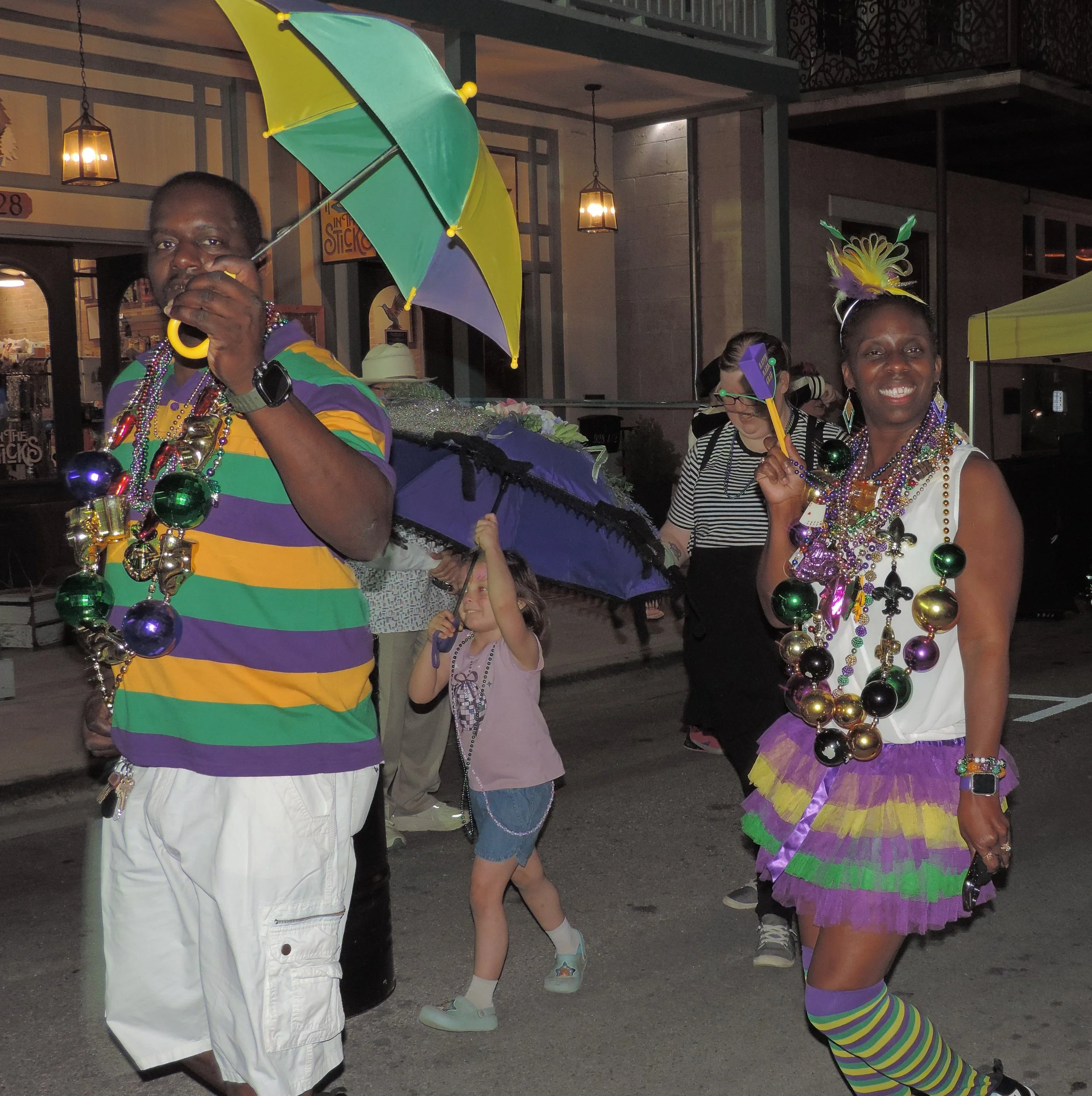 And then there were the new connections—people passing through Bastrop, people newly planted here, people looking for a sense of place. One conversation turned into a full story in itself: a man from Brooklyn, now in Texas after life shifted, talking about his late wife with the kind of tenderness that makes a crowd feel quiet even in the middle of a celebration. He spoke about family, discipline, raising children with intention, and returning to work not because he had to—but because he needed purpose again. In between all the Mardi Gras color, that was a reminder: community isn’t only celebration—it’s also belonging.