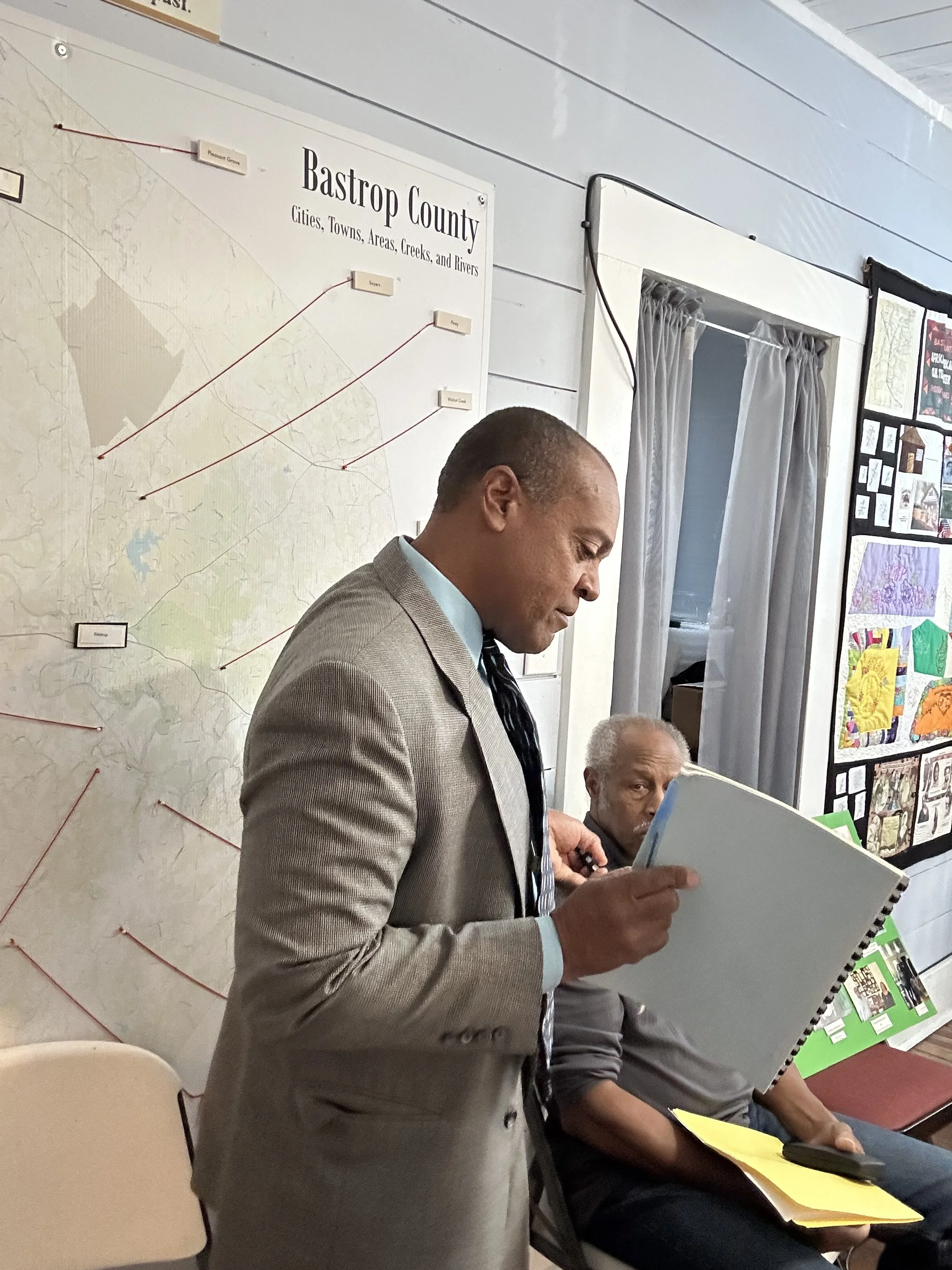 As guests settled in, surrounded by quilts sewn by Freedom Colony descendants and storyboards of Cedar Creek, Piney, and Mt. Olive, the storytellers began sharing the lived history of Black settlement, community-building, landownership, and resilience in Bastrop County.