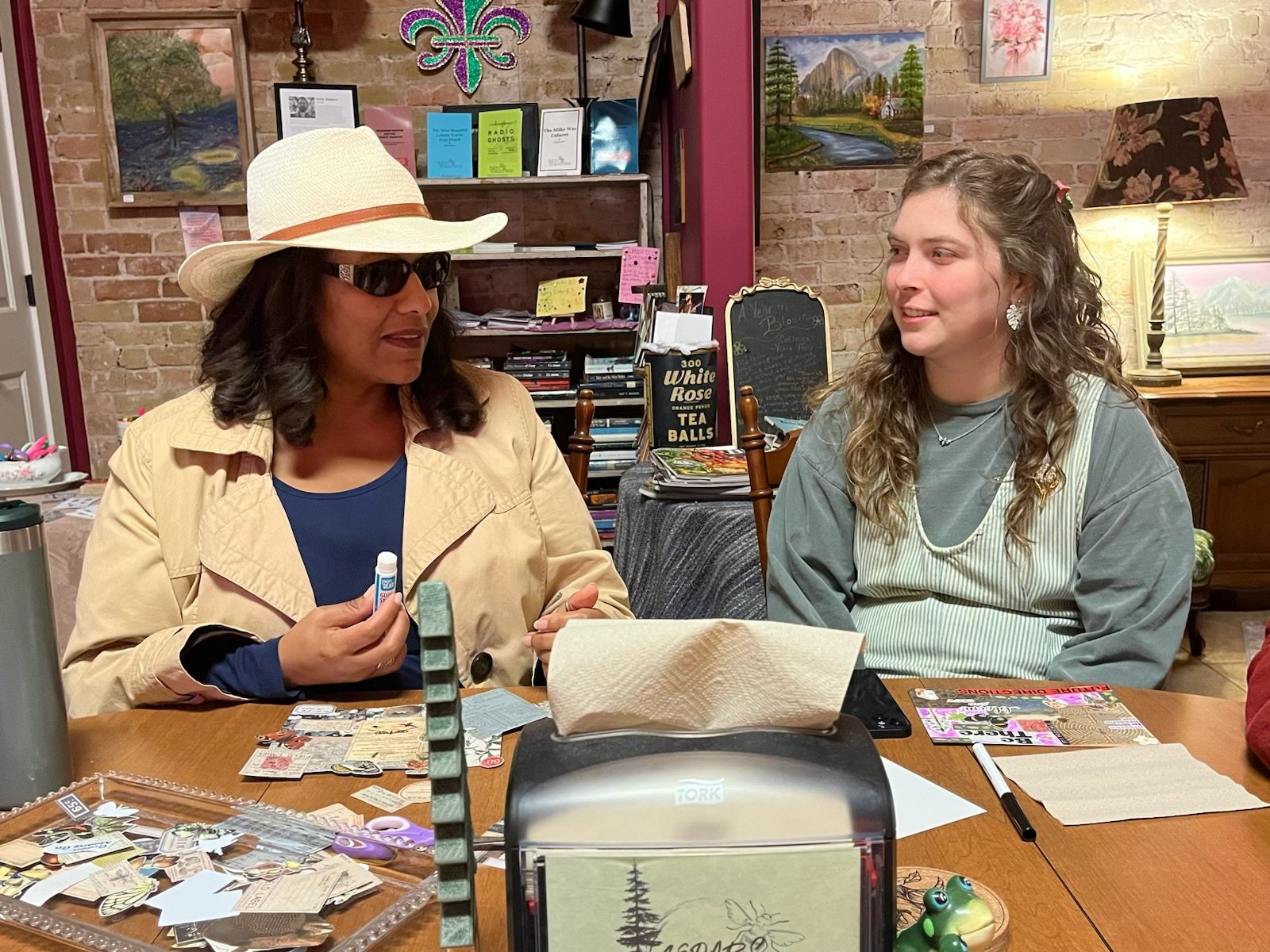 The second station invited guests to build collage mood boards using magazines, stickers, and found images—an open-ended craft designed to let “your mood take you where it takes you,” as the host described it. The goal wasn’t perfection. It was presence: sitting down, slowing down, talking with people, and letting the creative process loosen what the week had tightened.