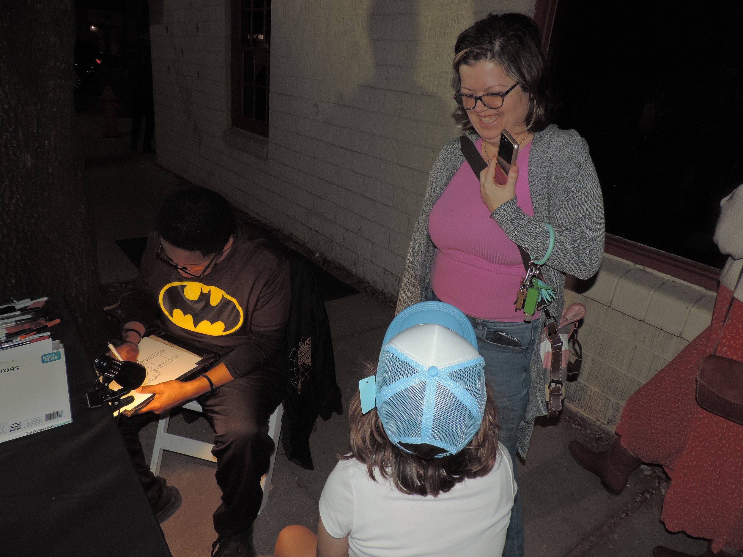 Robert Reed, caricature artist, captures a young child’s likeness as her guardian looks on nearby. The moment ends with smiles and gratitude, as the child walks away holding her new caricature—an unexpected keepsake from a night rooted in joy, creativity, and community connection.