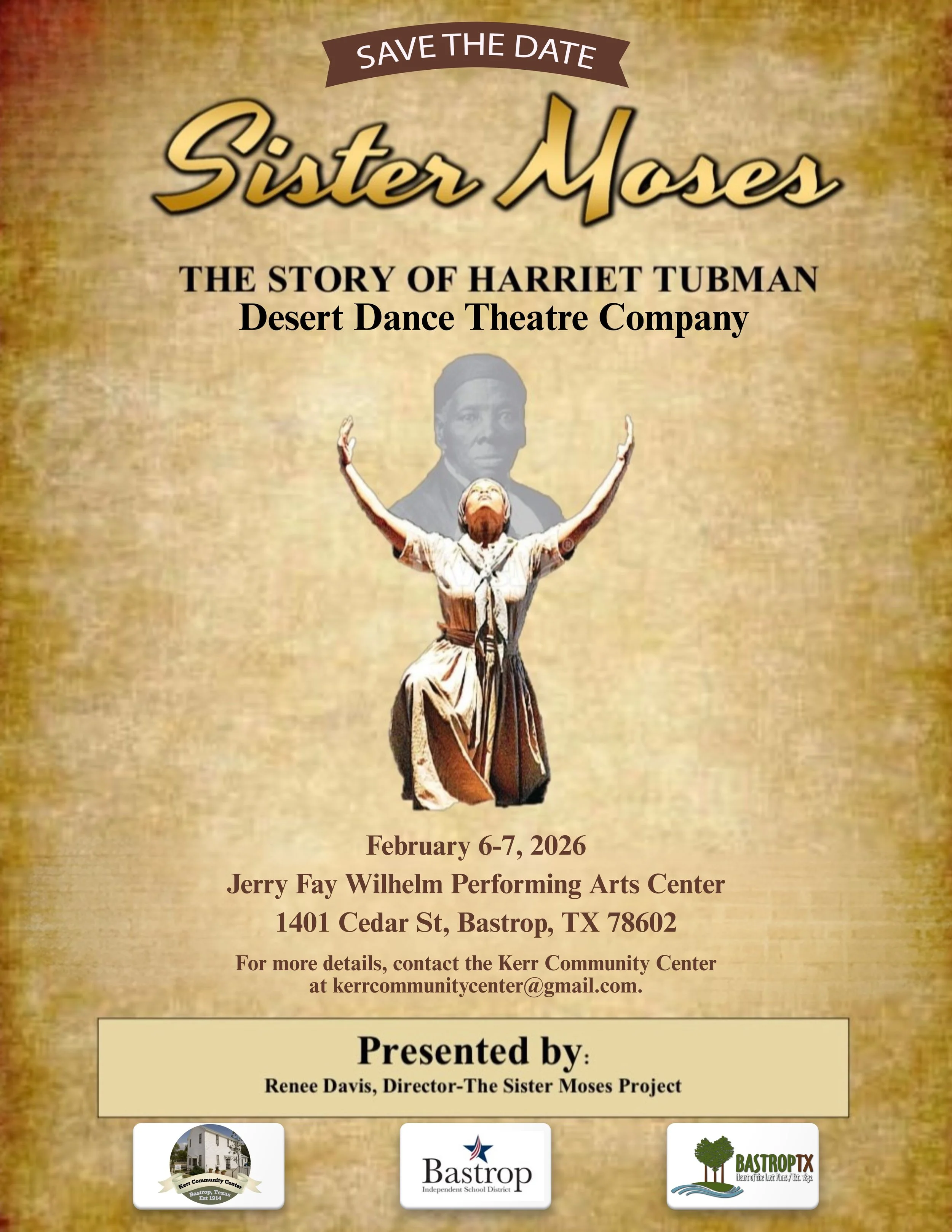 A significant portion of the meeting focused on updates for the Sister Moses Project, a nationally recognized dance, music, and narrative production portraying the life of Harriet Tubman. Funded in part by the City of Bastrop, the project is scheduled for February 6–7, 2026, at the Bastrop Independent School District Performing Arts Center, which has been donated for student matinees.